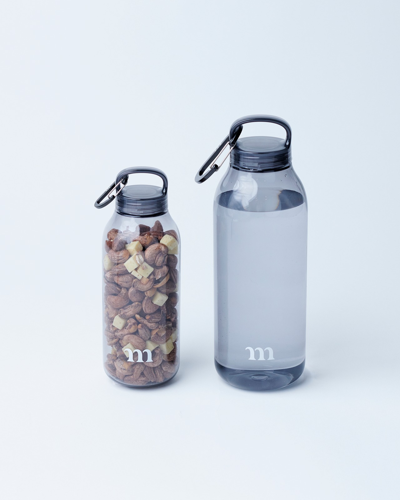 毎日の水分補給をサポートする軽量でコンパクトなWATER BOTTLE。傷がつきにくく割れにくい特性を持つ、日常使いに適した素材を採用しました。1回転で簡単に開け閉めできる蓋は、手にフィットして持ちやすいハンドル付きで、気軽に持ち歩けるデザインです。ハンドルにはmuracoのカラビナが付属しているので、バッグなどに引っ掛けることができます。水を入れることで素材の透明感やフォルムの美しさがより際立ちます。持ち運びに最適な500mlサイズ。