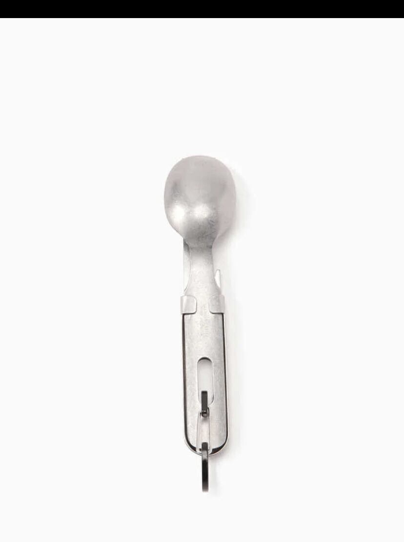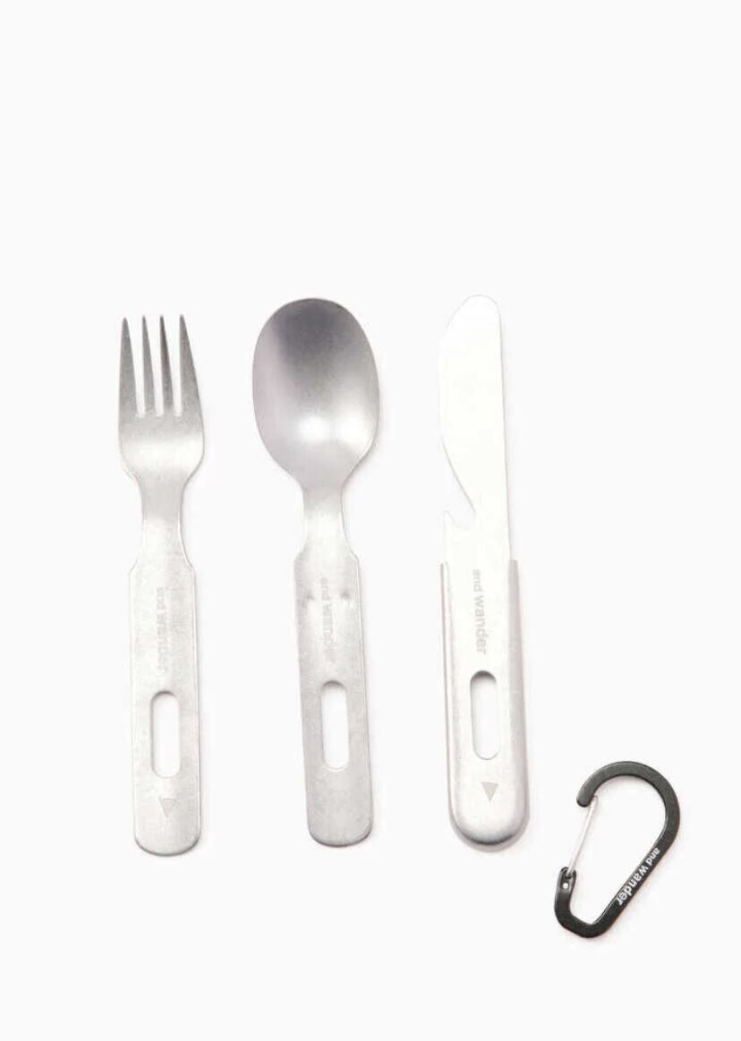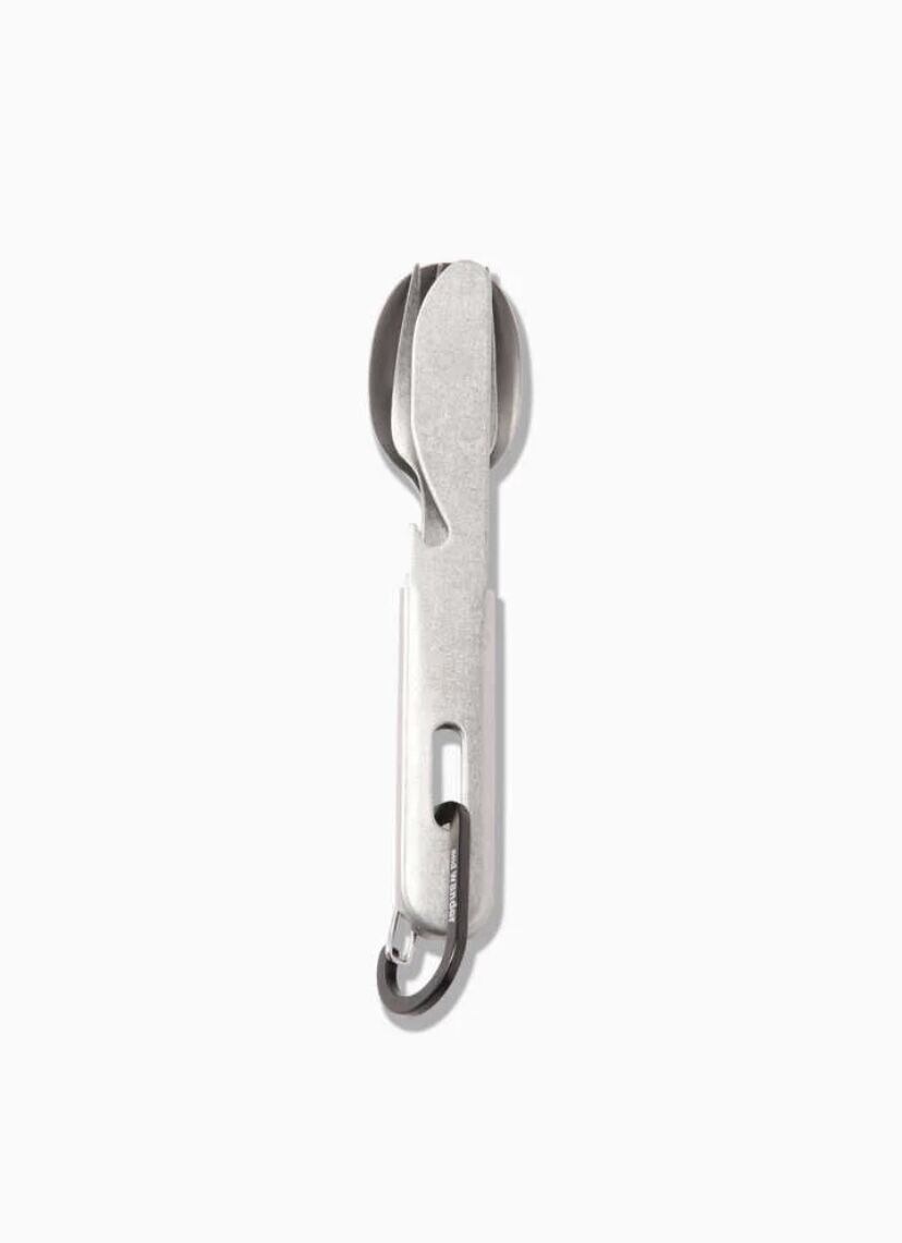 A set of spoon, knife and fork. You can store the spoon and fork in the sleeve of the knife. A carabiner is attached so that you can hang them. Made in Japan of stainless steel material.