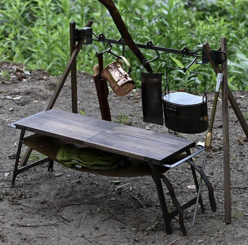 木材と鉄を使ったアウトドアギア。鉄部分が錆びるのが嫌というのも耳にします。私の中ではただ綺麗なギアよりも使って朽ちていく様が自分色を出せる一つの楽しみだと思っております。