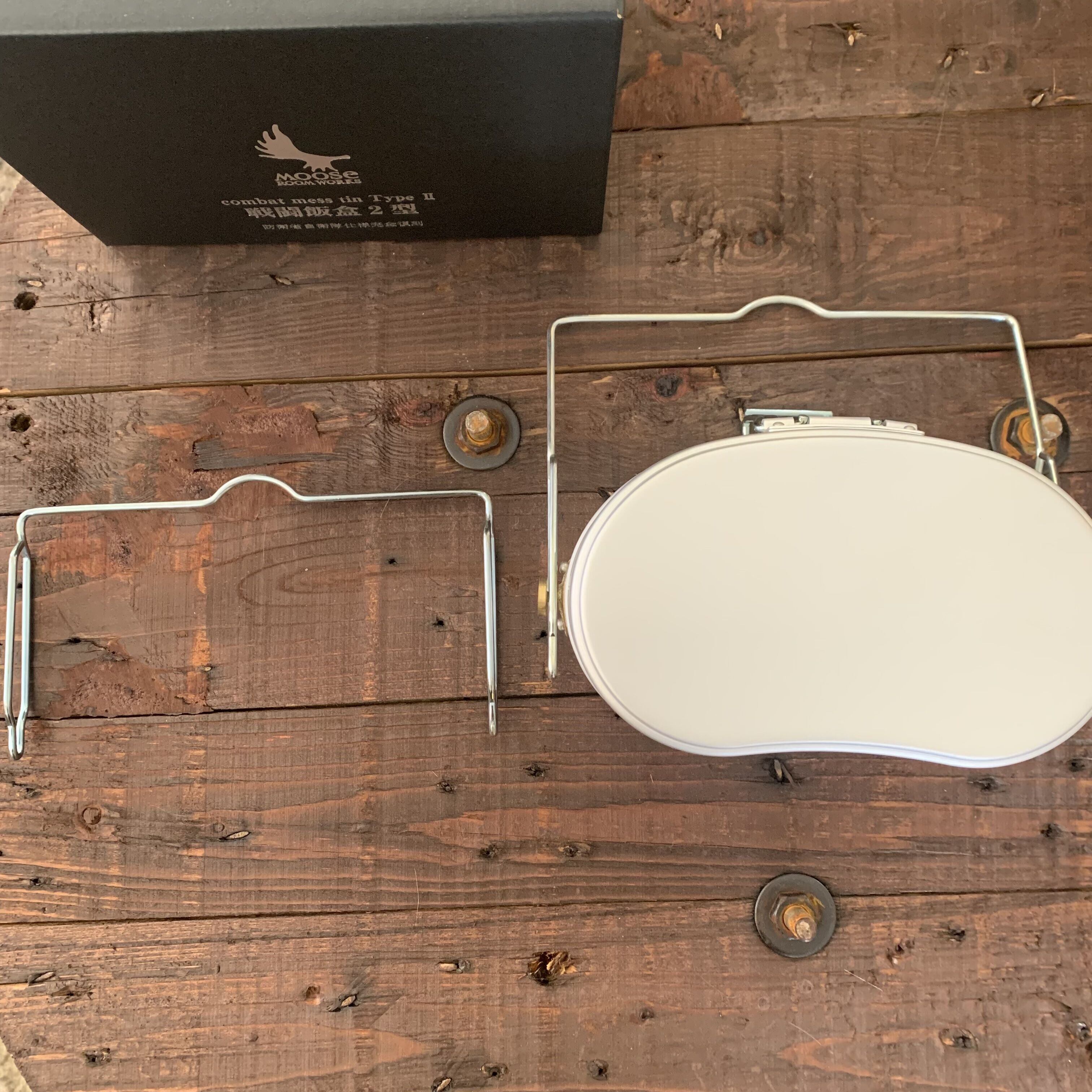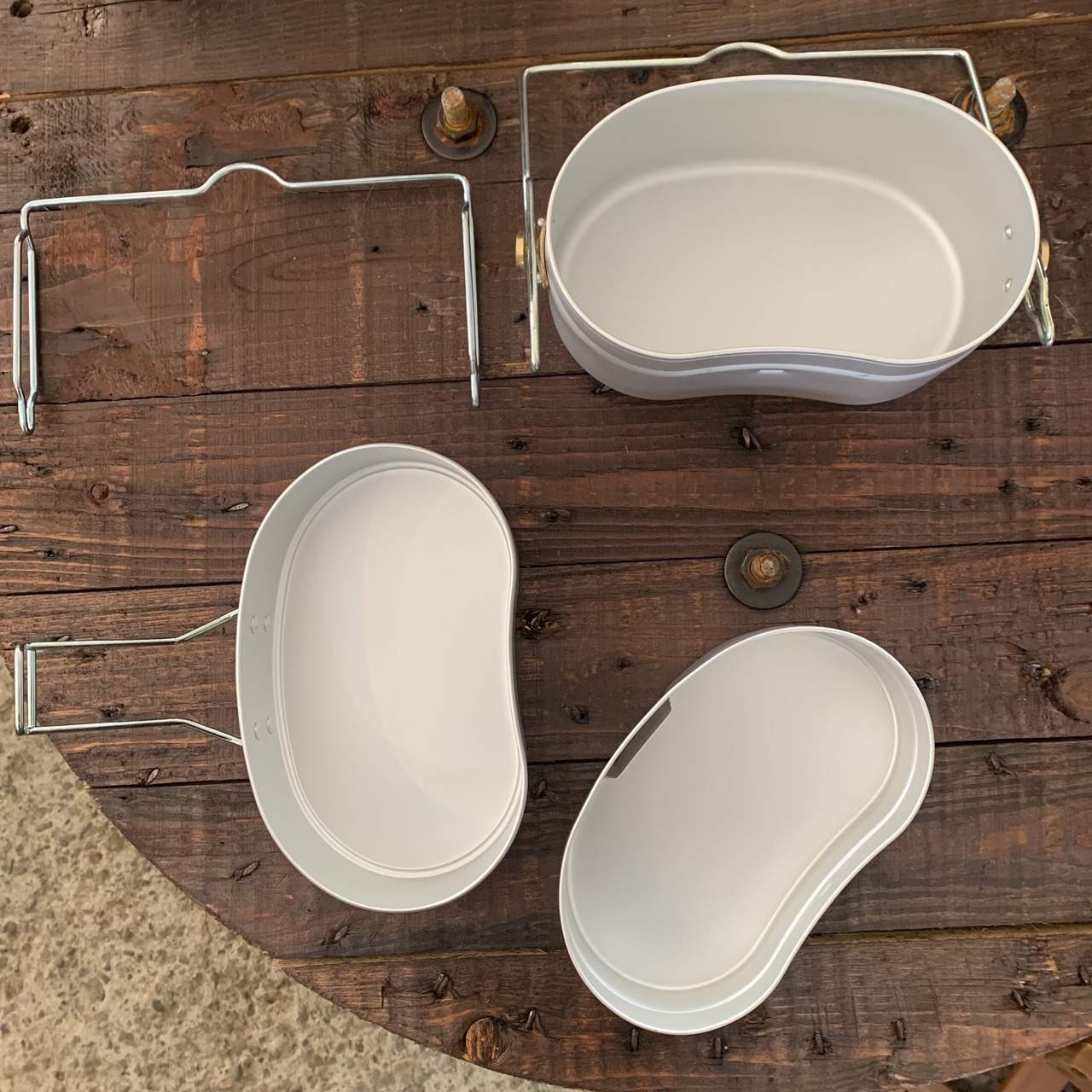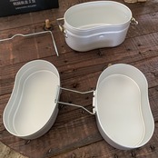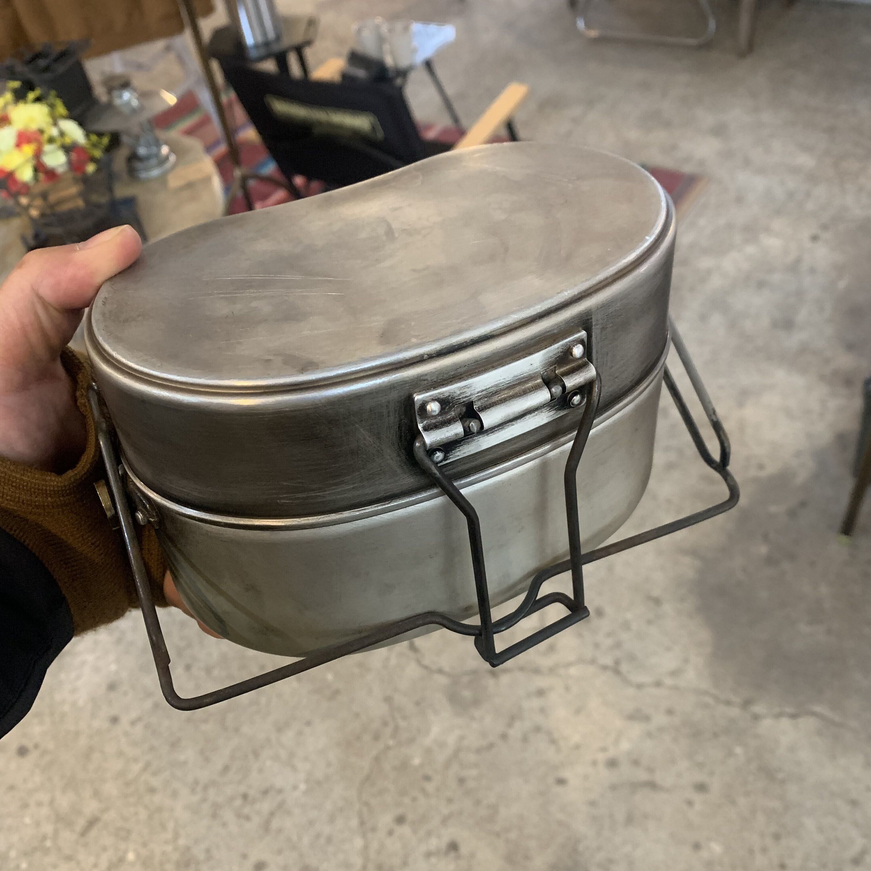 約10年前まで自衛隊内で主に配給の際に使われていた飯盒。自衛隊内でプラスチックの器に変更され、この戦闘飯盒2型を使われる事が少なくなったと聞いています。当時は上蓋と中子と呼ばれるパーツを写真の様に連結する事で2つの器を片手で持つことで配給を受けていたみたいです。