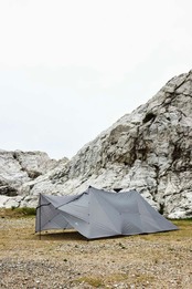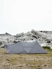 フライシート四隅をペグダウンした後にセンターポールを立てるだけで、非常に短い設営時間と少ない労力で大容量のシェルターを設置することができます。