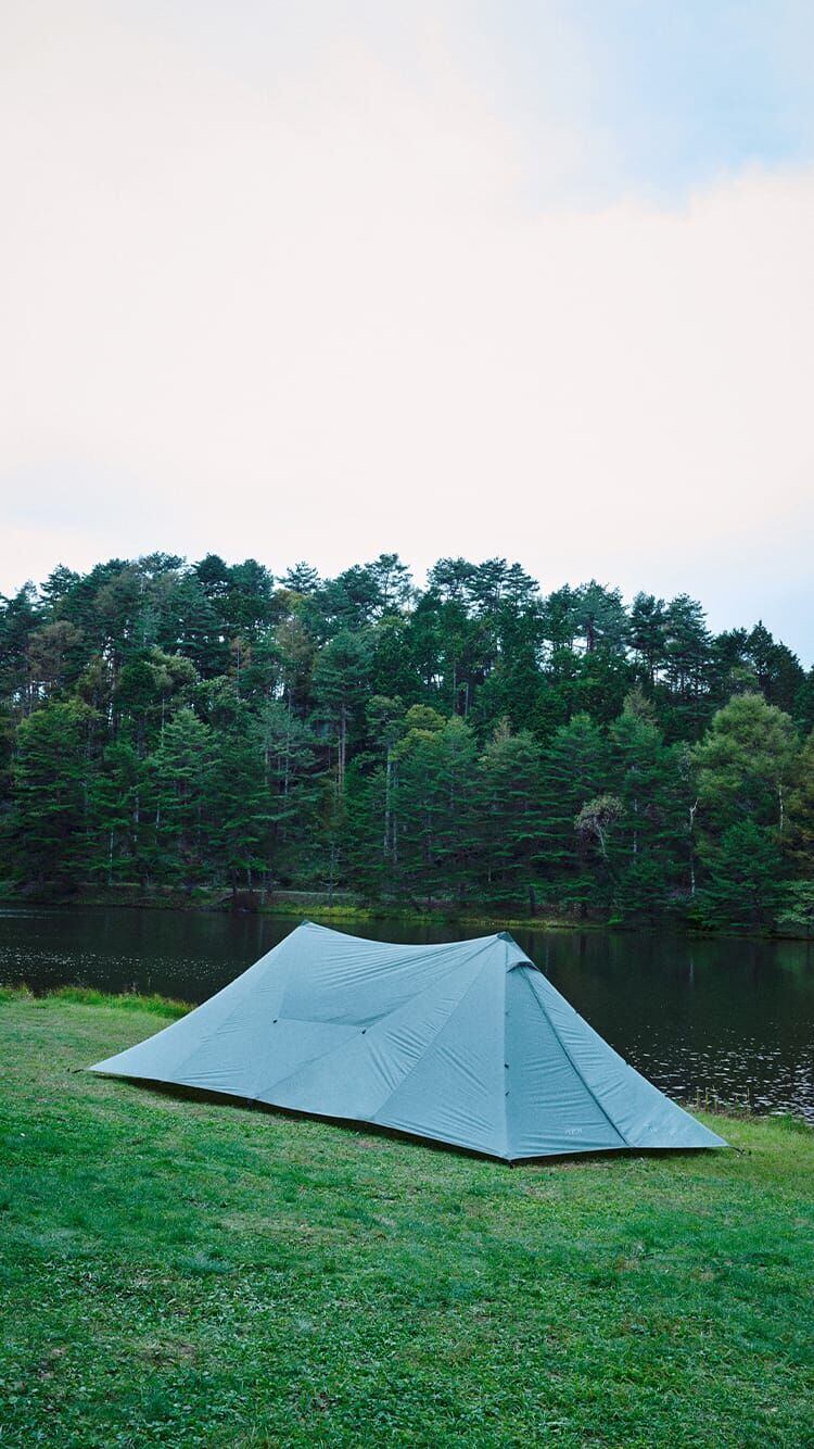 and wanderとmuracoでコラボレーションしたキャンプ用2ポールシェルターテントは、フライシートには耐水圧1500mmの40Dリップストップナイロン、インナーテントのフロア、グラウンドシートには耐水圧3,000mmの68Dリップストップポリエステル、ポールは直径25mmのアルミニウム合金を使用しています。