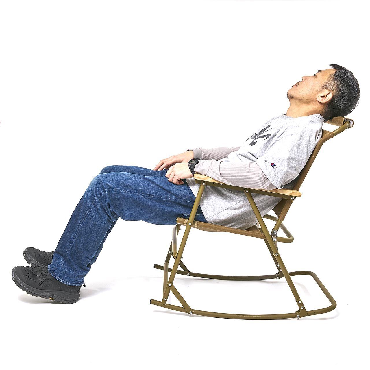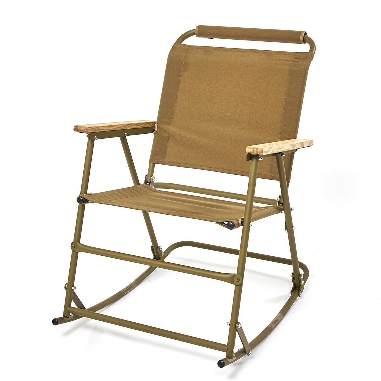 折りたためるロッキングチェア自体が珍しいのですが、ヘッドレストを備えたアルミ製という点も踏まえると他には類を見ない製品かと思います。当然ながら揺れる事自体も楽しいのですが、前後に動く事でちょっとした動作(作業)が思いのほか楽になります。