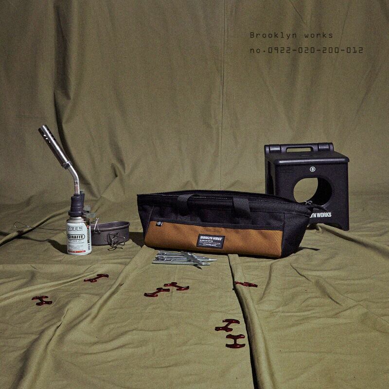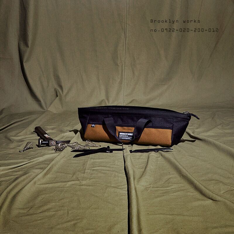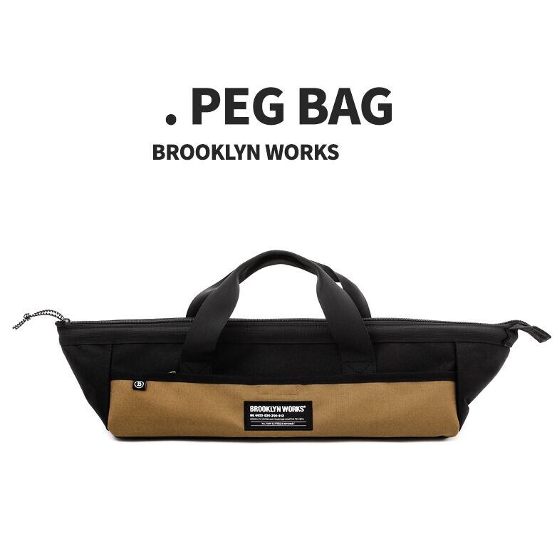 ブルックリンワークスの「ペグバック」です。 ペグダウンの為のペグとハンマーそしてグローブ。これをしっかり収納するスペースやバッグを お持ちでない方にお勧めです。 40cmペグまで収納可能で、最小限の容積でペグとハンマー類を収納して持ち運べるように製作されたペグバッグです。 素材:ポリエステル・ポリプロピレン サイズ:W52cm×H12cm×D13cm