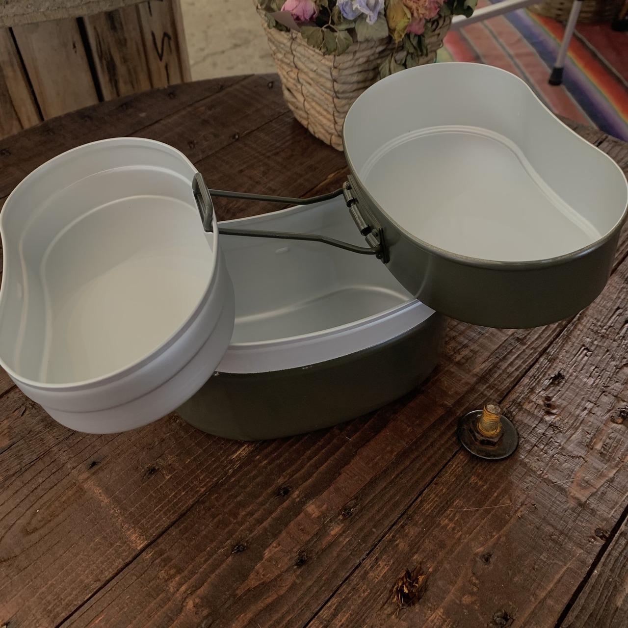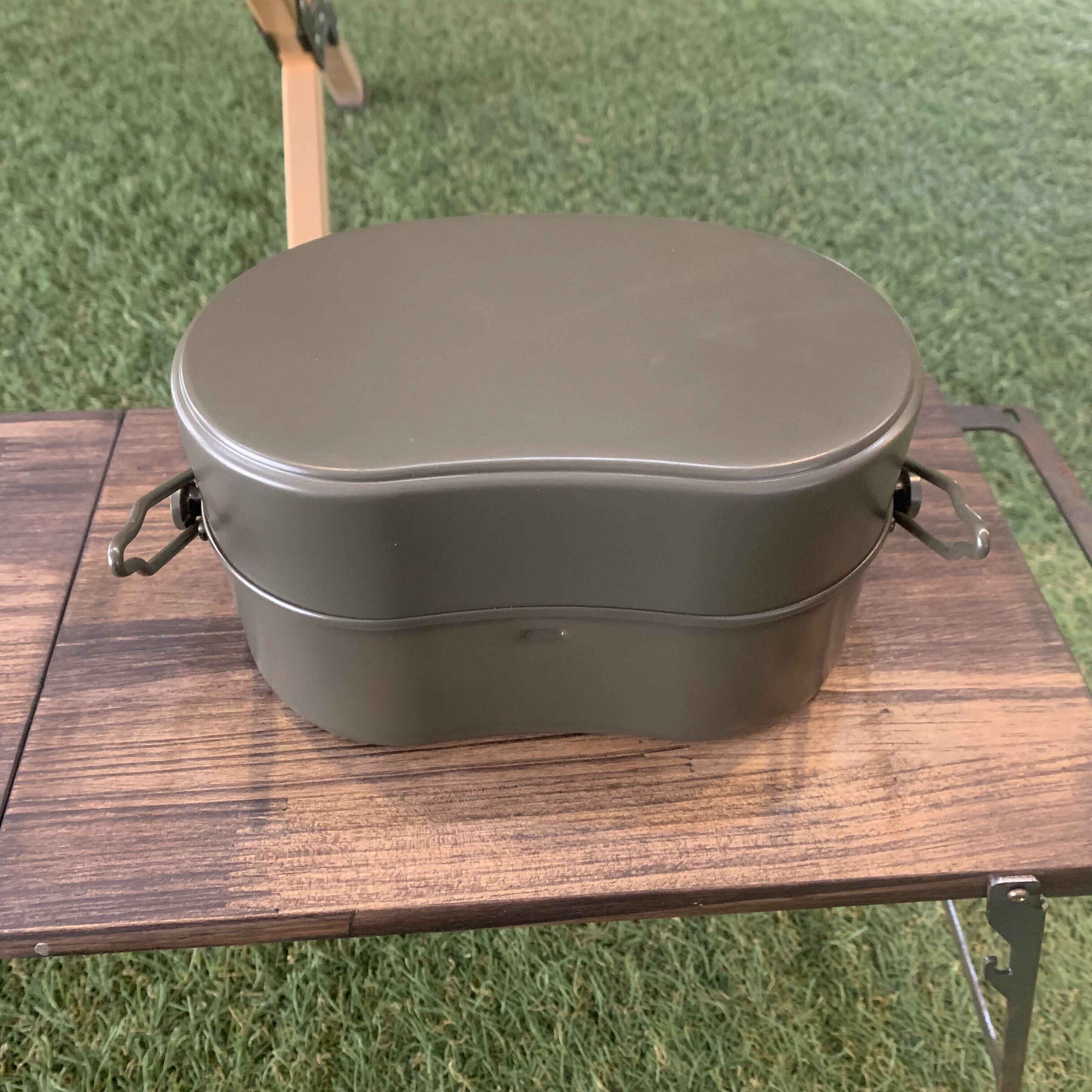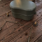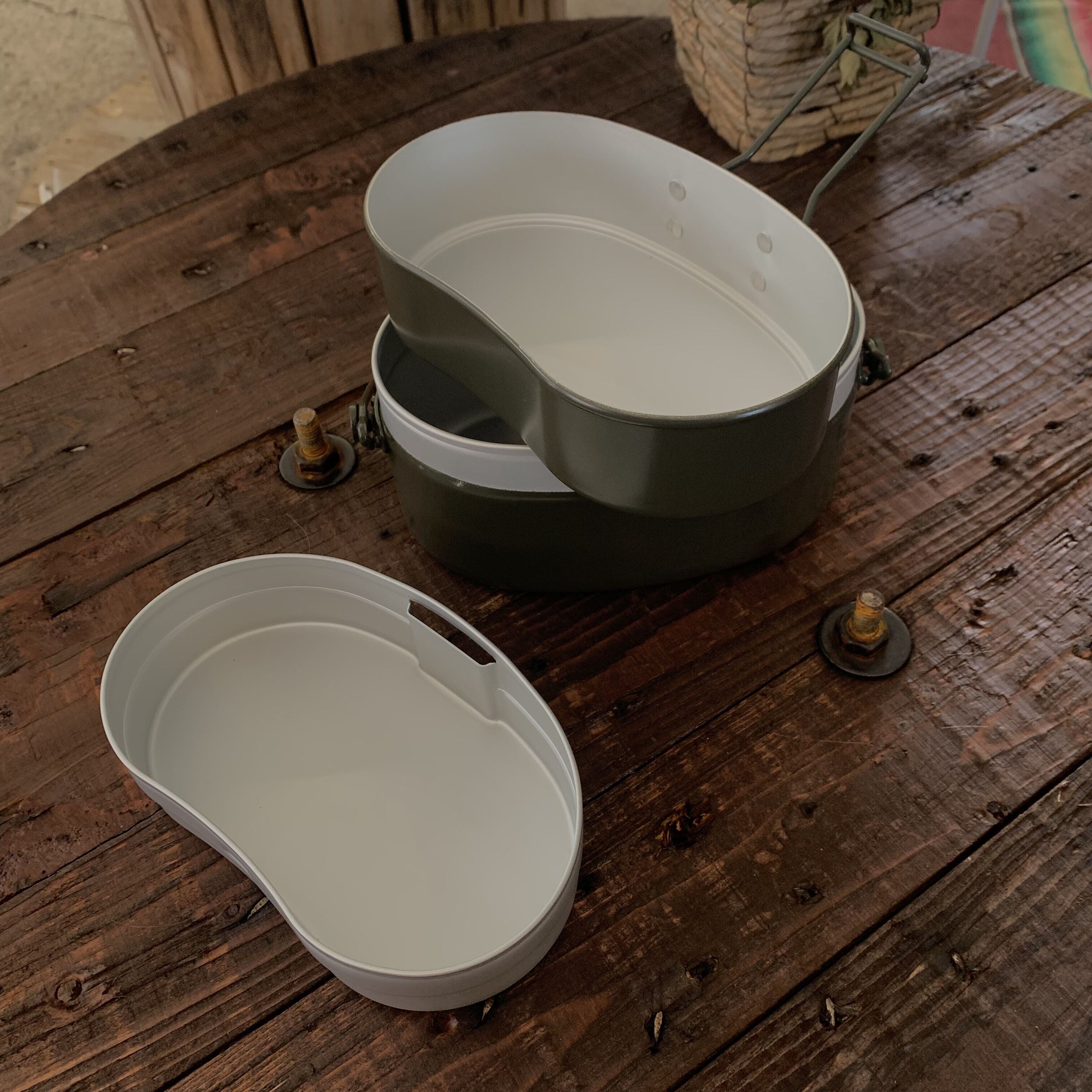 約10年前まで自衛隊内で主に配給の際に使われていた飯盒。自衛隊内でプラスチックの器に変更され、この戦闘飯盒2型を使われる事が少なくなったと聞いています。当時は上蓋と中子と呼ばれるパーツを写真の様に連結する事で2つの器を片手で持つことで配給を受けていたみたいです。