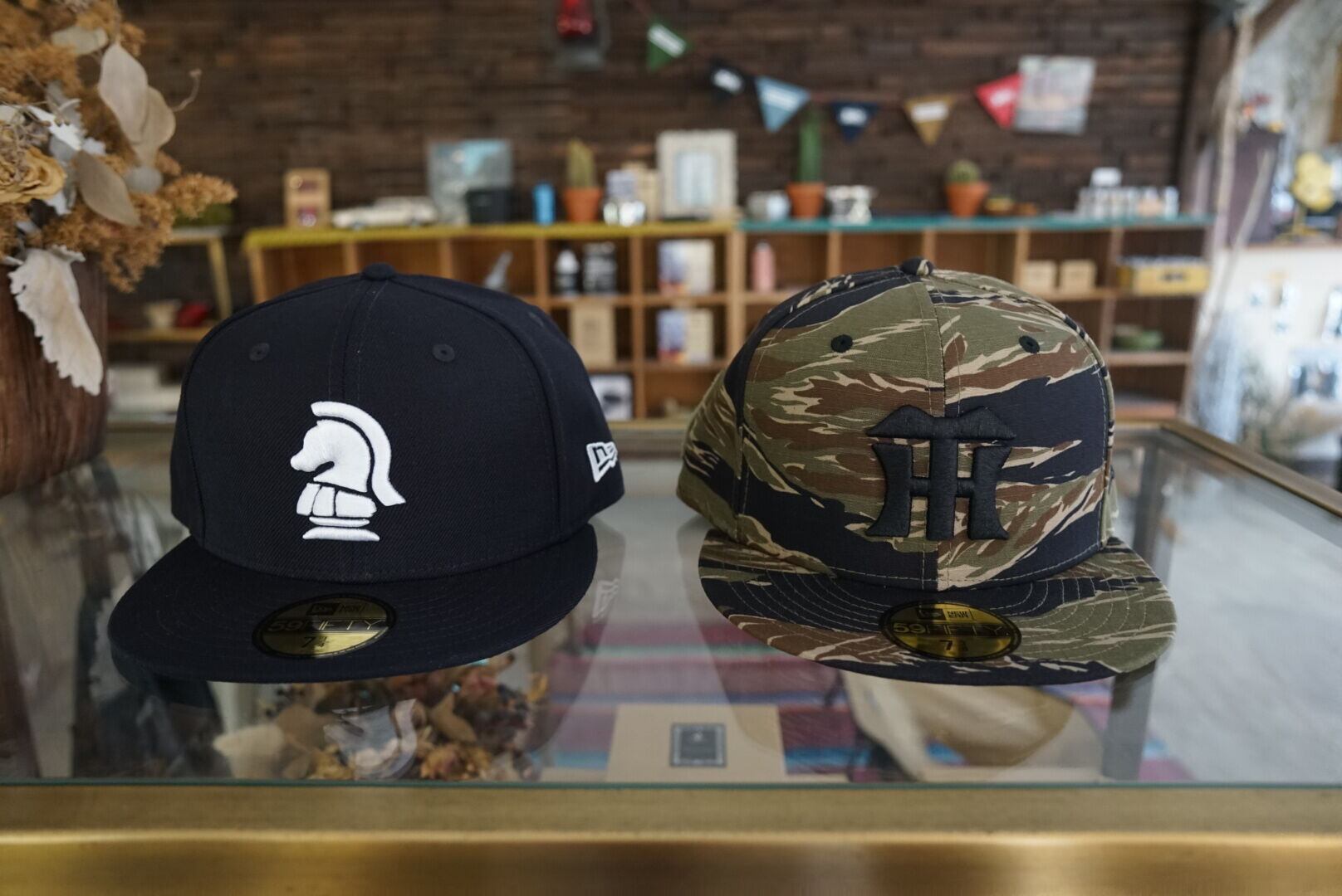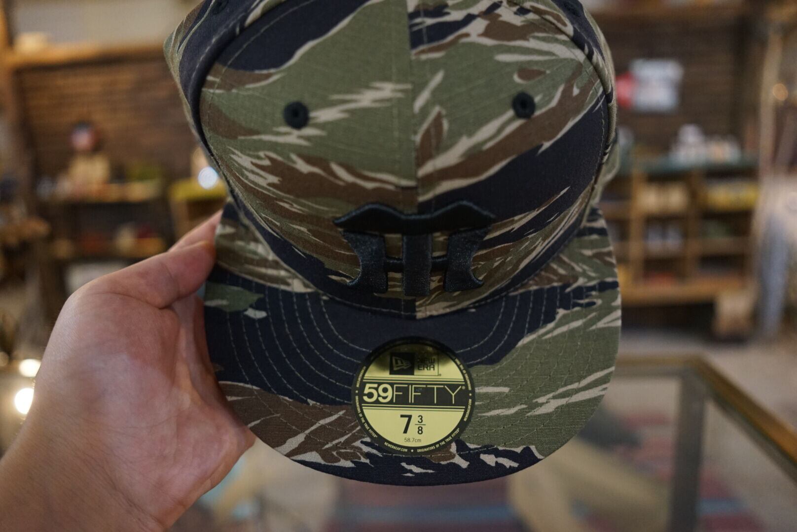 1色は、NEW ERA社定番のWOOL100%「NYヤンキースカラー」、もう 1色は寅年ならではの思い付きでタイガーストライププロダクツ社のタイガーカモ素材を弊社支給にて製作いただきました。