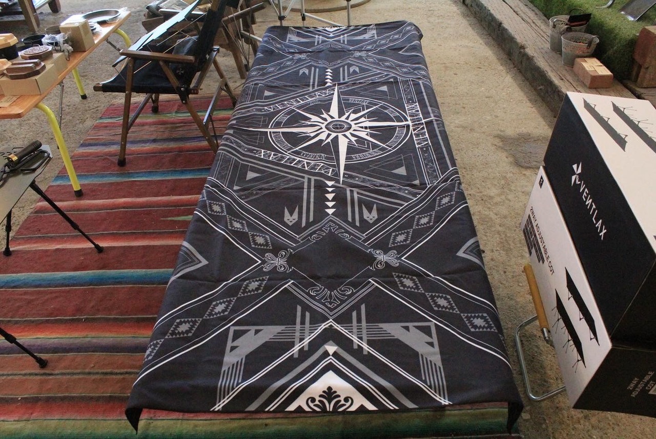 羅針盤をモチーフにした幾何学デザインとVENTLAXロゴを全面に散りばめたモノグラムデザインのリバーシブルデザインはキャンプ場で大注目間違いなし。
