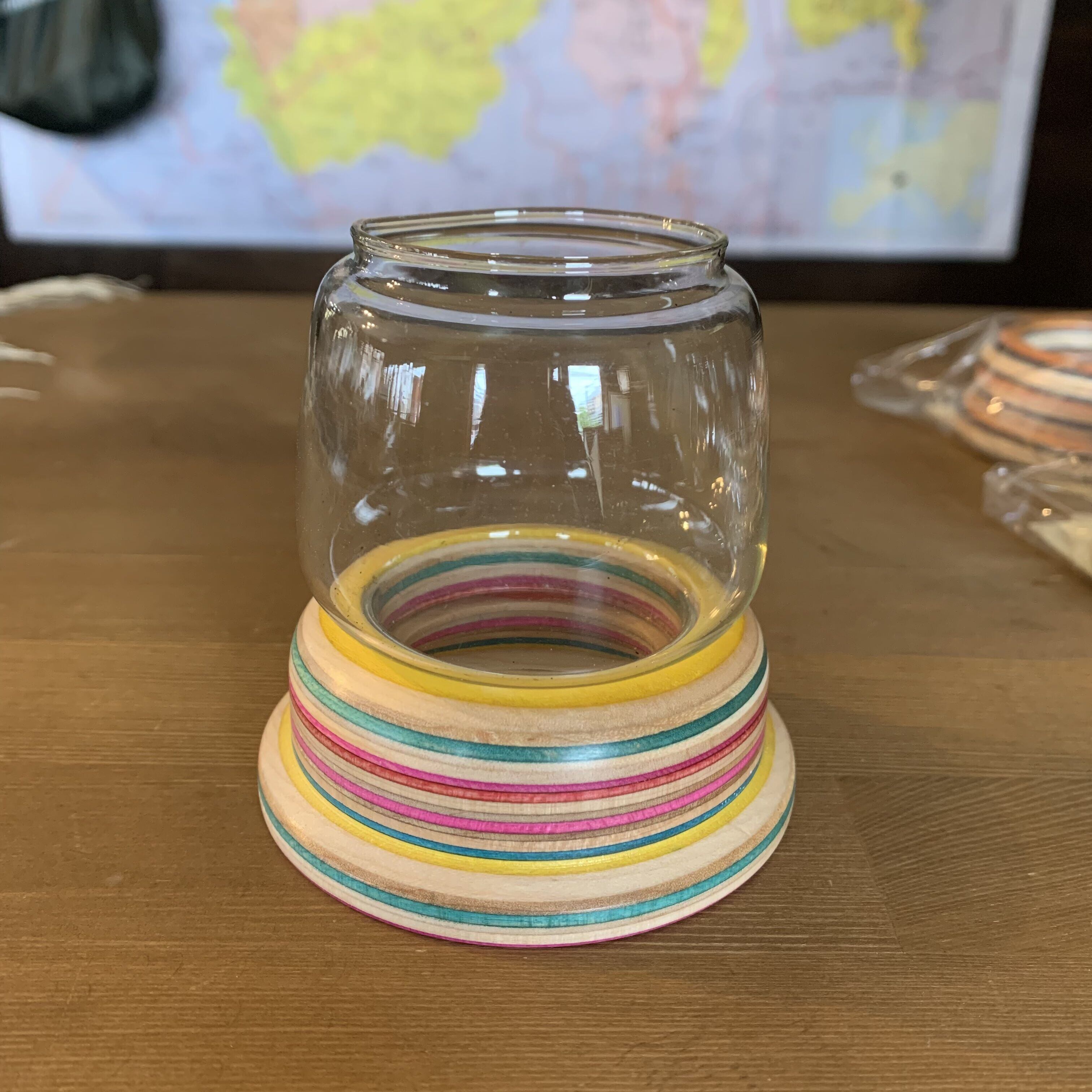 オイルランタンのタンクをモチーフにし、ベランダやキャンプなどの風のある環境ではミニオイルランタンのホヤをつけることで火を風から守ってくれます。