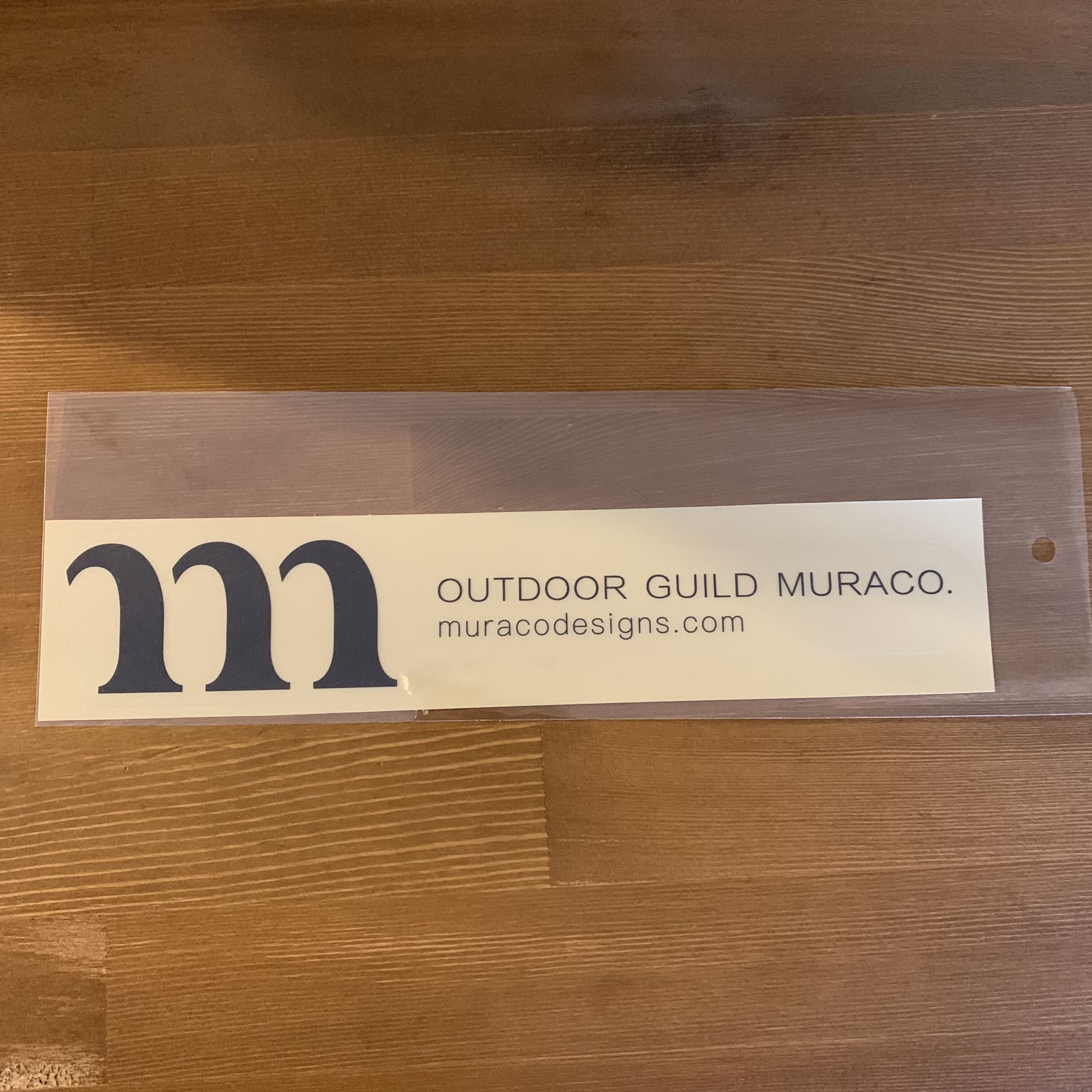 mロゴと「OUTDOOR GUILD MURACO.」の文字が印刷されたムラコオリジナルステッカー。バイク、クーラーボックス、スケートボード、サーフボード、自転車、車など、好きなところにお貼りください。