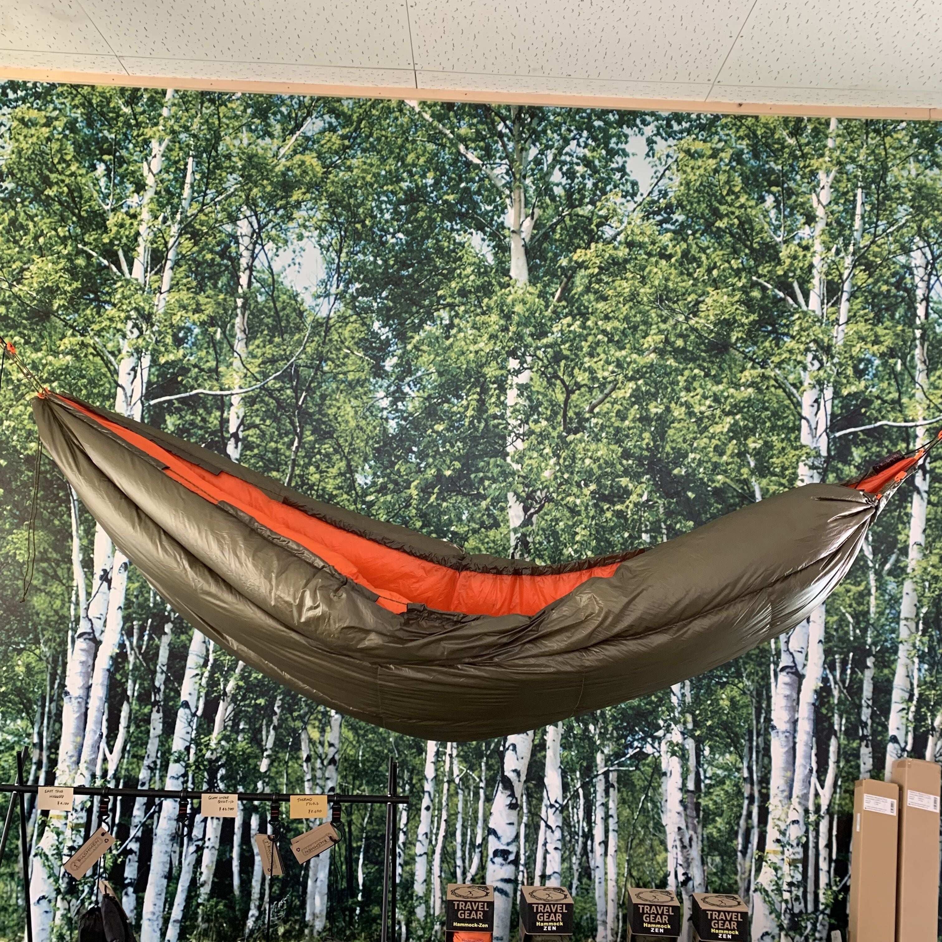 使う場面によって羽毛ダウンの動きが変化するのも特徴です。ハンモックと合わせて使う時は、羽毛ダウンが収縮部分から足を置く部分に移動し、キルトや寝袋として使う時は、羽毛ダウンが全体に満遍なく広がります。