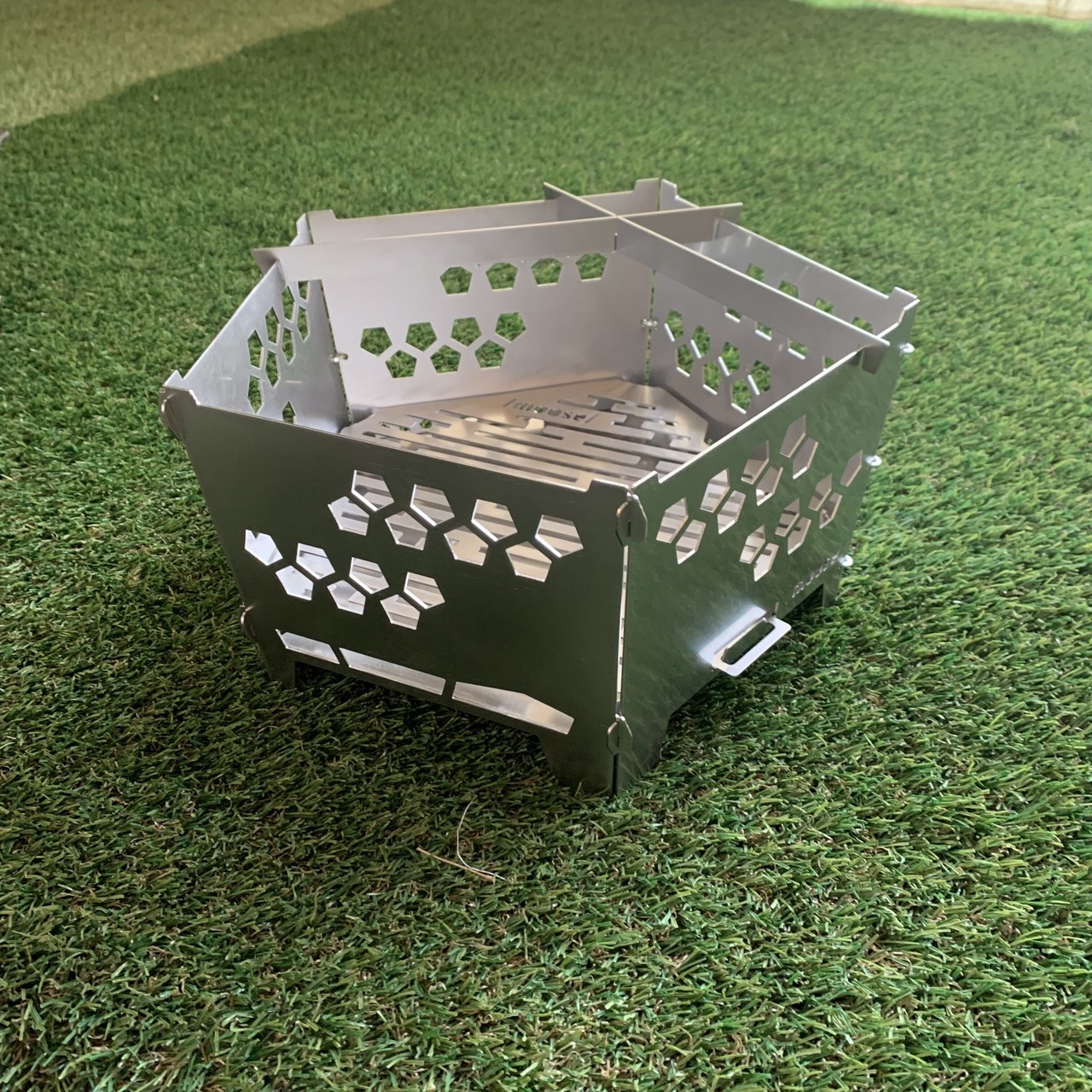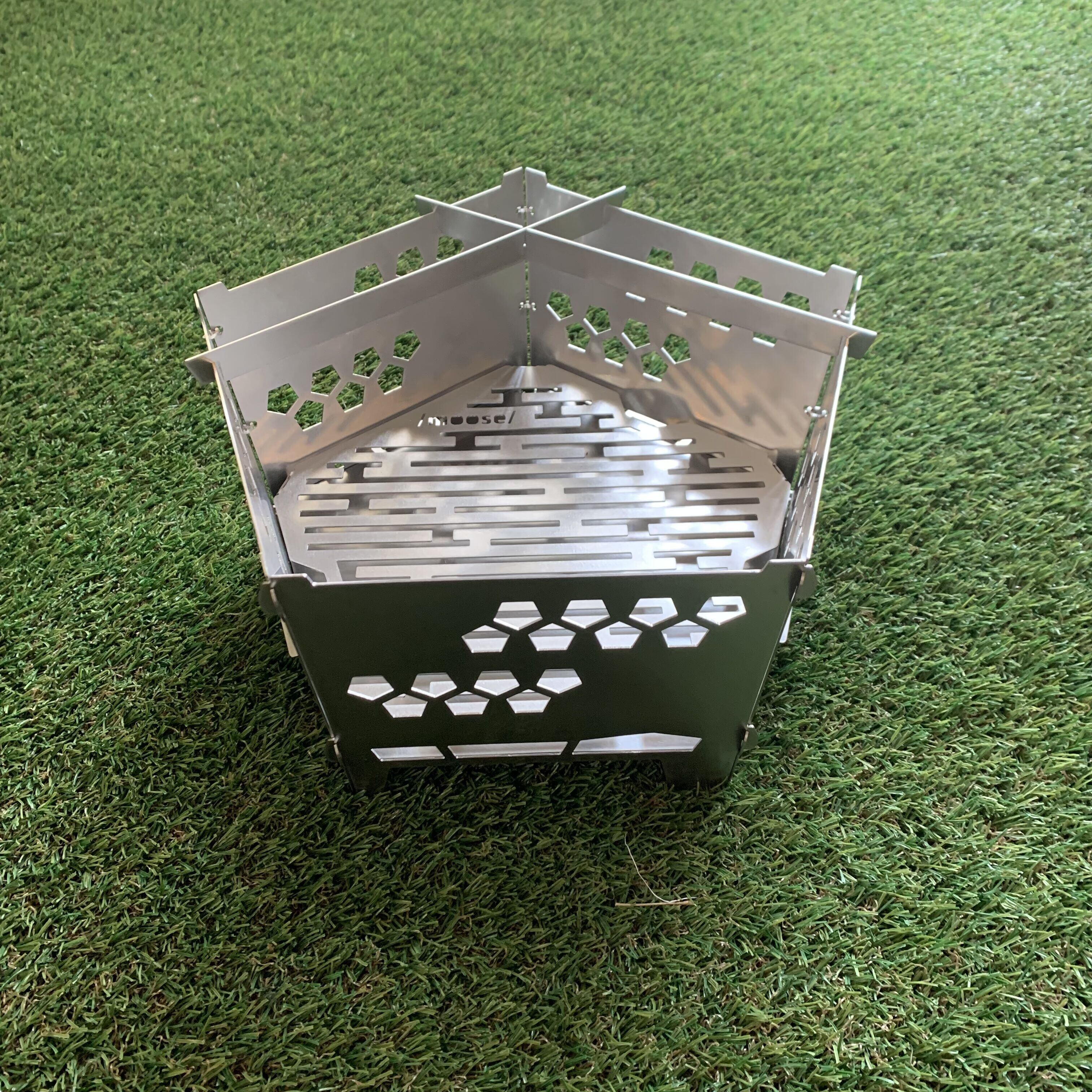 素材はSUS304を使用。パーツ構成は側面1枚(4枚連結)、正面1枚のパネル、ロストル、灰受けの4パーツで構成。重さは1.1kgと軽量かつ持ち運びもコンパクト。専用五徳も付属しています。