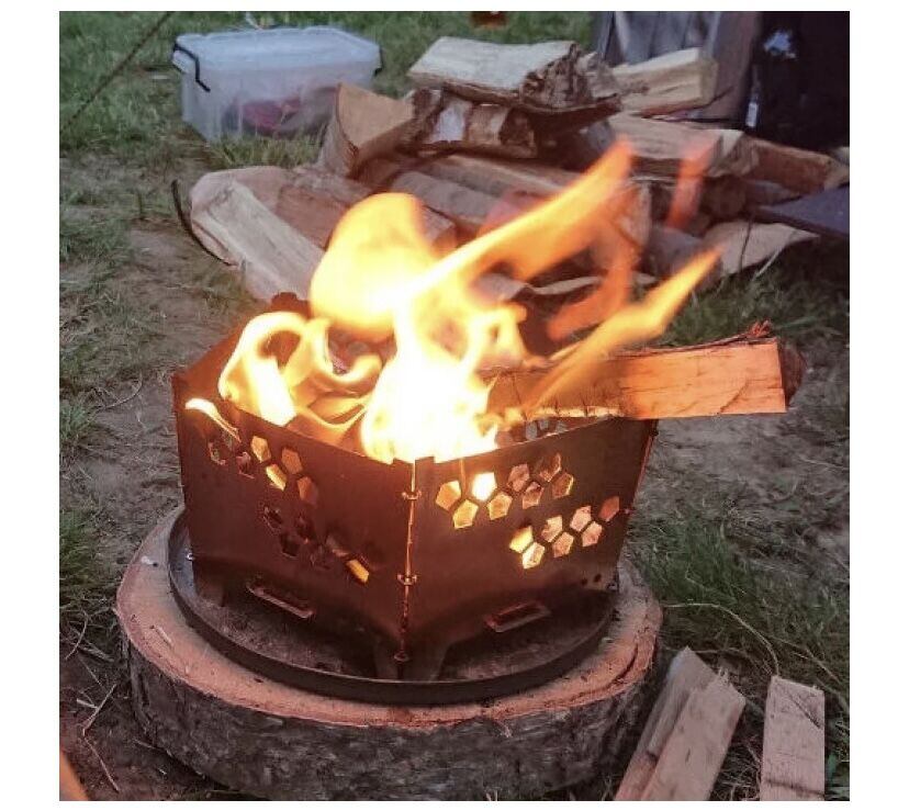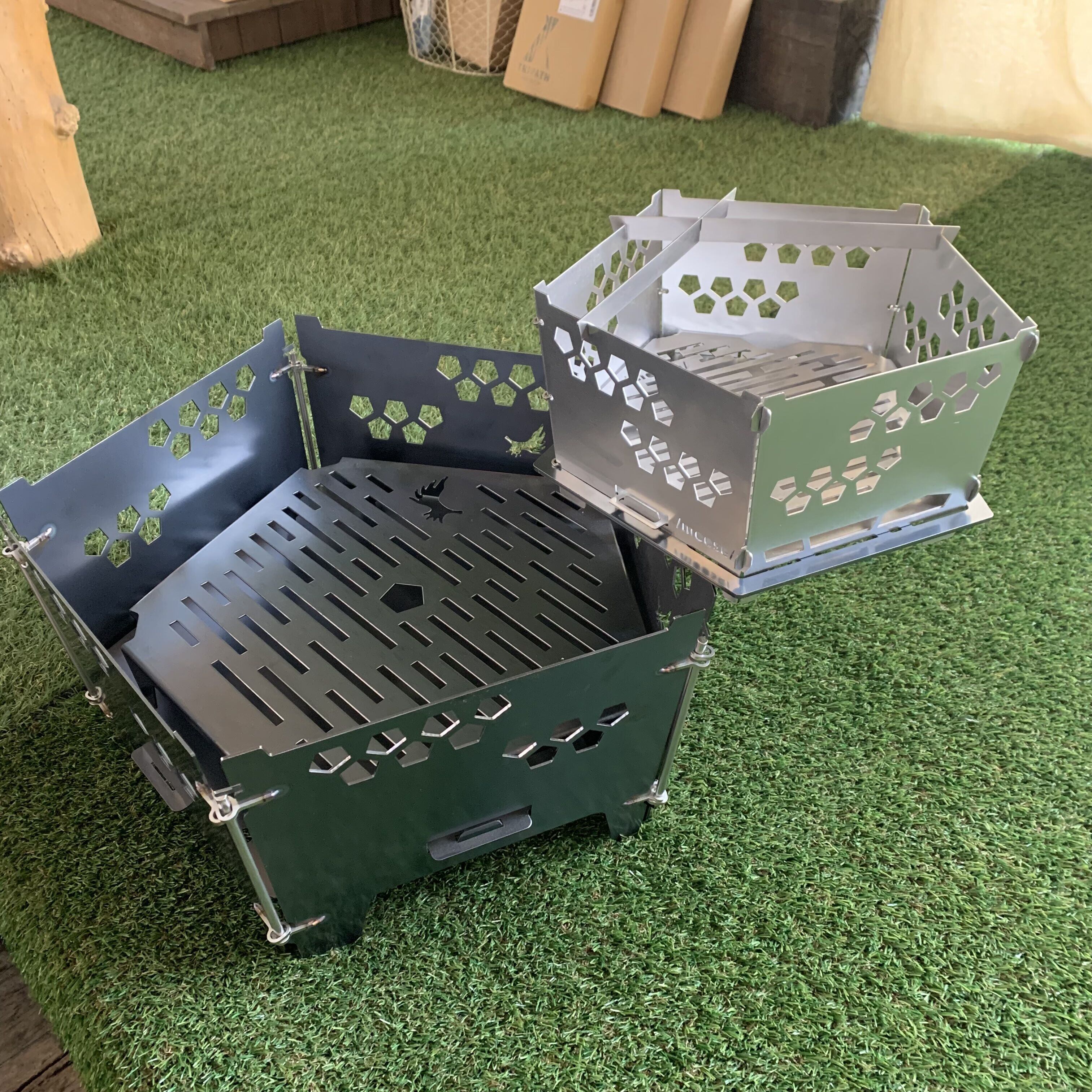 組み立ては約30秒。4枚の側面パネルは独自のCカンを使用して連結されています。パネルを五角形状に開いて灰受けをセット。正面パネルを差し込んでロストルを乗せるだけ。難しいアクションは一切無し。誰でも簡単に組み立てが出来ます。